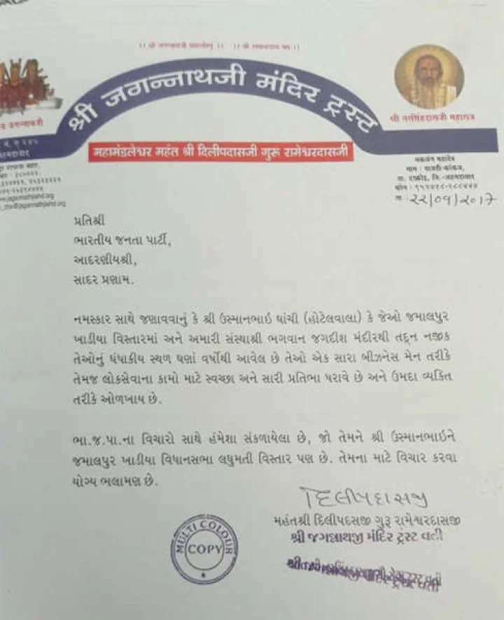 જમાલપુરની ટિકિટ મુસ્લિમ ઉમેદવારને આપવા જગન્નાથ મંદિરના મહંતે કરી ભલામણ