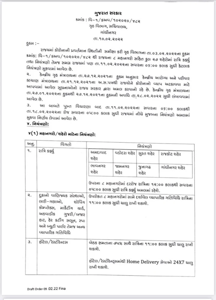 કોર કમિટીમાં લેવાયેલા નિર્ણય અનુસાર હવે 11 ફેબ્રુઆરીથી રાજ્યના માત્ર 8 મહાનગરો માં આગામી 18 ફેબ્રુઆરી 2022 સુધી દરરોજ રાત્રે 12 વાગ્યાથી સવારે 5 વાગ્યા સુધી રાત્રિ કરફ્યુ અમલમાં રહેશે.