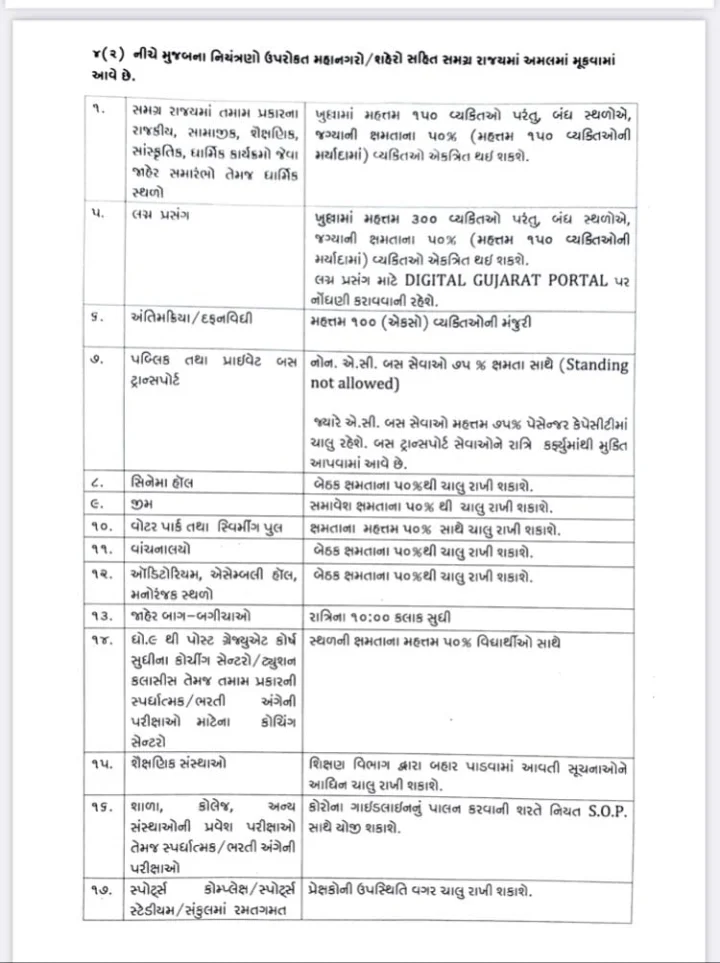 લગ્ન પ્રસંગો માટે નિયંત્રણો: ખુલ્લી જગ્યામાં માત્ર 300 લોકોની મર્યાદામાં યોજી શકાશે. જ્યારે ઇન્ડોર સ્થળે ક્ષમતાના 50% તથા મહત્તમ 150 લોકોની મર્યાદામાં લોકો ભેગા થઈ શકશે. લગ્ન માટે ડિજિટલ ગુજરાત પોર્ટલ પર નોંધણી કરાવવાની રહેશે.