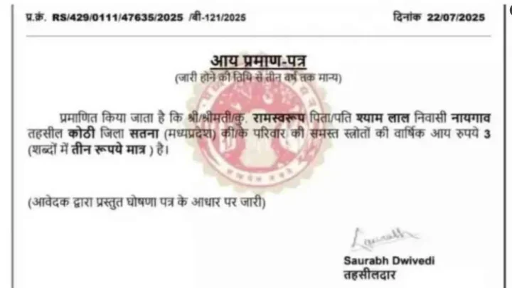 આવક પ્રમાણપત્ર મુજબ, આ ખેડૂત એક દિવસમાં એક પૈસો પણ કમાઈ શકતો નથી. તેને 25 પૈસા કમાવવામાં એક મહિનો લાગે છે. કોંગ્રેસે આ આવક પ્રમાણપત્રનો ફોટો શેર કરીને રાજ્ય સરકાર પર કટાક્ષ કર્યો છે.